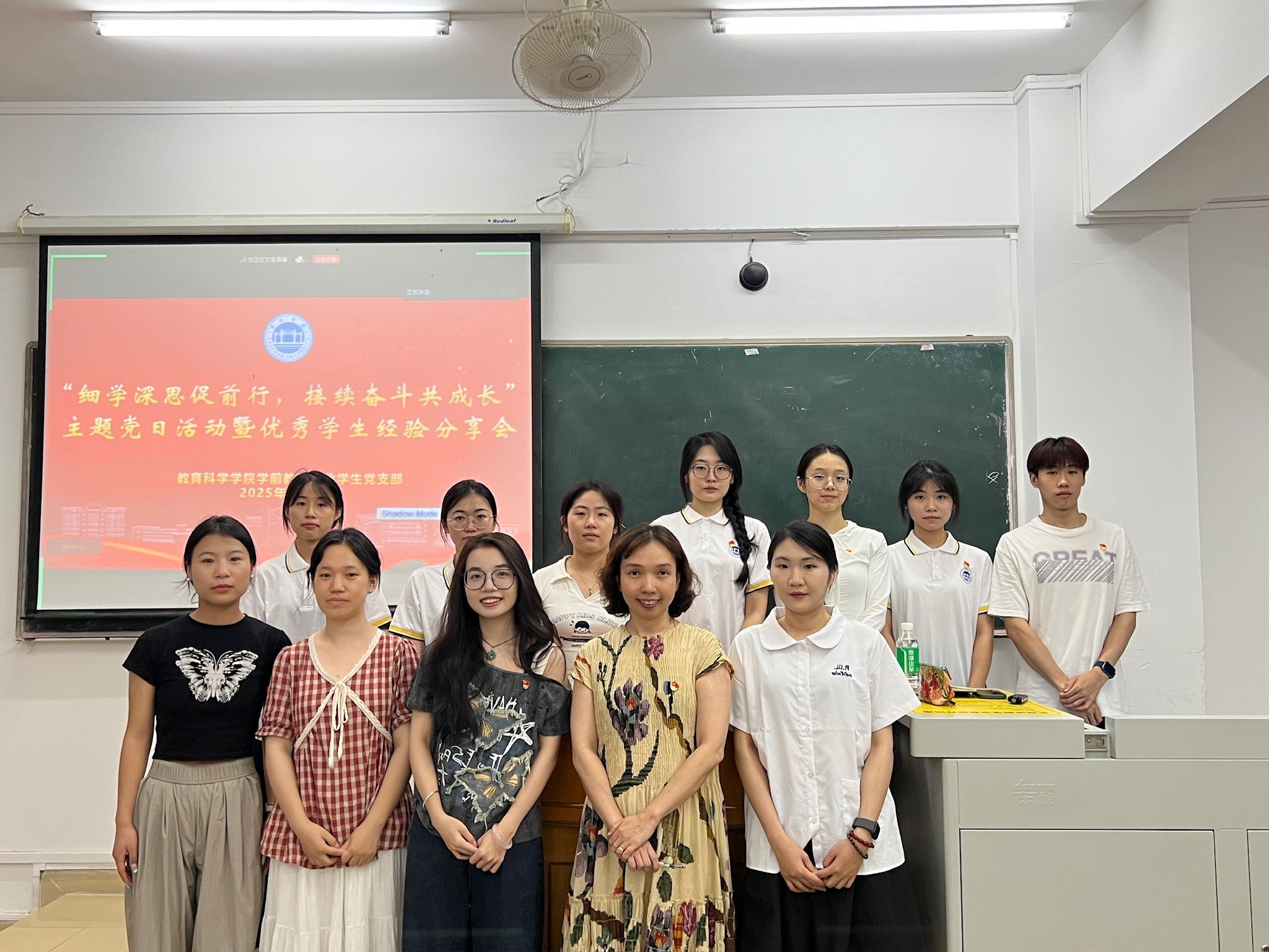 5 月 16 日晚,学前教育专业“细学深思促前行,接续奋斗共成长” 主题党日活动暨优秀学生经验分享交流会在第二教学楼317室顺利召开。会议由温桃主持,学前教育专业学生党支部书记何秀华出席,2021级学前教育专业杨、朱晓婷、刘秋怡、陈雪莹、2022级学前教育专业周荩跞等优秀学生担任主讲嘉宾,60余名学前教育专业学生参与交流。