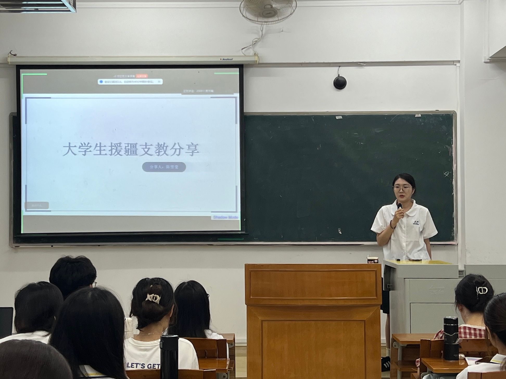 在援疆支教分享环节,陈雪莹同学分享了她的援疆支教经历,从支教工作概述、准备、教学实践和个人成长等方面展开。她讲述了在新疆南疆的支教生活,虽然面临孤独感、语言障碍等挑战,但通过开展丰富的活动、进行公开课教学,不仅将内地教育理念带到新疆,也提升了自身的教学技能和综合能力。她还介绍了学校援疆支教的招新时间、报名条件和面试流程,鼓励同学们积极参与,在奉献中实现自我成长。