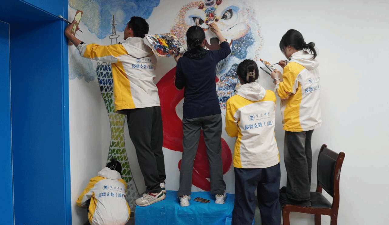 支教队员们选择广州塔和醒狮两大广东特色元素进行墙绘,为幼儿园打造了一道充满岭南风情的文化景观。广州塔作为广东的标志性建筑,寓意着粤新两地心手相牵,塔身如彩虹桥连接天山与珠江,象征广东支教大学生架设团结友爱的纽带。同时醒狮作为广东的特色,更是中国优秀传统文化的一部分,狮首昂扬象征着援疆大学生敢为人先的担当,锦羽翻飞化作民族团结的七彩绸带。