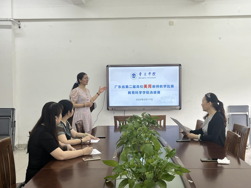 选拔赛由教育科学学院院长助理周彩虹主持,教育科学学院李晖教授、金振丽副教授、黄春蕾副教授担任评委,选拔赛由评委们根据学院学前教育系、教育学系美育相关的课程教师的课堂实录进行打分、点评,并对参加校赛的后续事项准备提出了针对性建议。经过评委们的推选,我院学前教育系郭琳老师、教育学系梁爽老师将参加肇庆学院美育教师教学比赛。