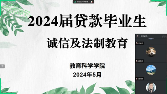 为进一步增强贷款毕业生“诚信贷款、按时还款”意识,5月22日晚上8点,教育科学学院举办了2024届贷款毕业生诚信及法制教育专题线上会议。我院辅导员陈慧妍、梁少辉、朋辈辅导员龚碧莹以及2024届全体贷款毕业生参加了此次会议。