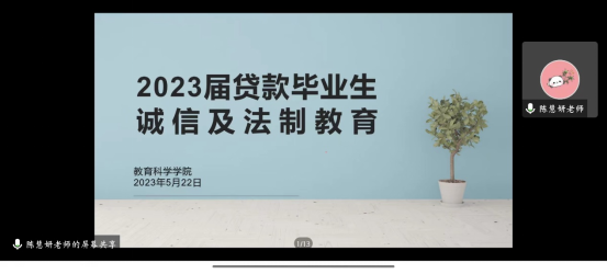 为进一步增强贷款毕业生“诚信贷款、按时还款”意识,5月22日晚上7点,教育科学学院在腾讯会议举办了2023届贷款毕业生还款指导暨诚信及法制教育专题会议。我院辅导员陈慧妍、朋辈辅导员蓝妍妍以及2023届全体贷款毕业生参加了此次会议。