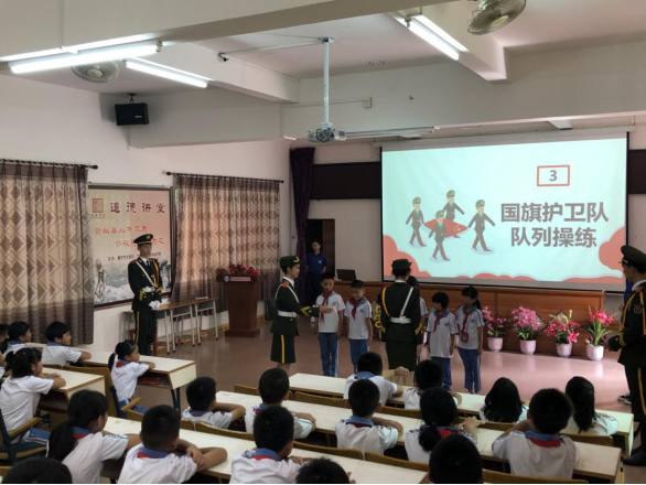 在升旗仪式上,肇庆学院国旗护卫队队员步履铿锵地迈向升旗台,全体师生面向国旗行注目礼、少先队员行少先队礼,随着师生高亢洪亮的歌声,鲜艳的五星红旗冉冉升起。升旗仪式结束后,义教组的志愿者们为少先队员代表开设了一堂“学习国旗护卫队精神,弘扬爱家爱国情怀”主题思政课,通过此次微思政课的开展,提高在场少先队员对国旗和国旗护卫队的认识,进一步提高学生爱家爱国情怀。