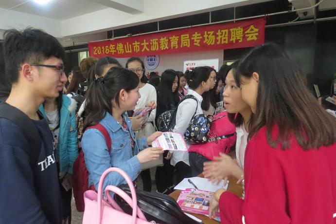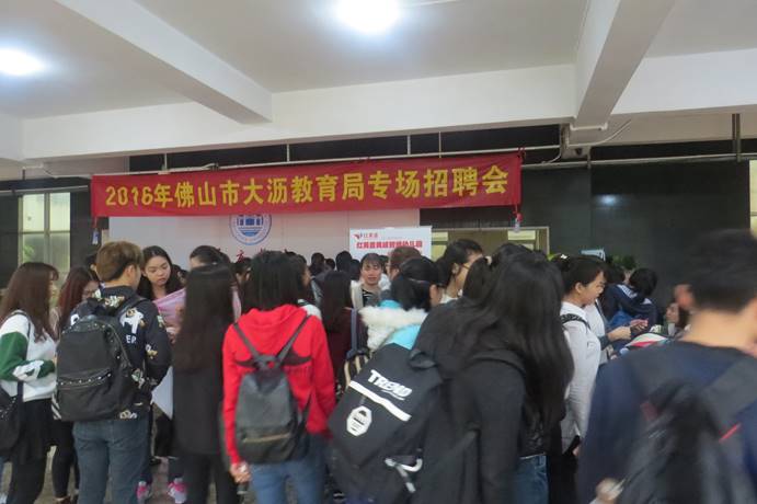 (教科院 袁咏茵讯)为拓宽我院2016届毕业生的就业渠道,积极搭建用人单位和毕业生洽谈交流的平台,经我院领导多次与佛山市大沥教育局沟通协调,于2016年3月19日,在我校顺利举办了2016年佛山大沥教育局专场招聘会,就业处梁建梅处长亲临现场指导。来自教育科学学院、体育与健康学院等学院的学生人数达150多人。