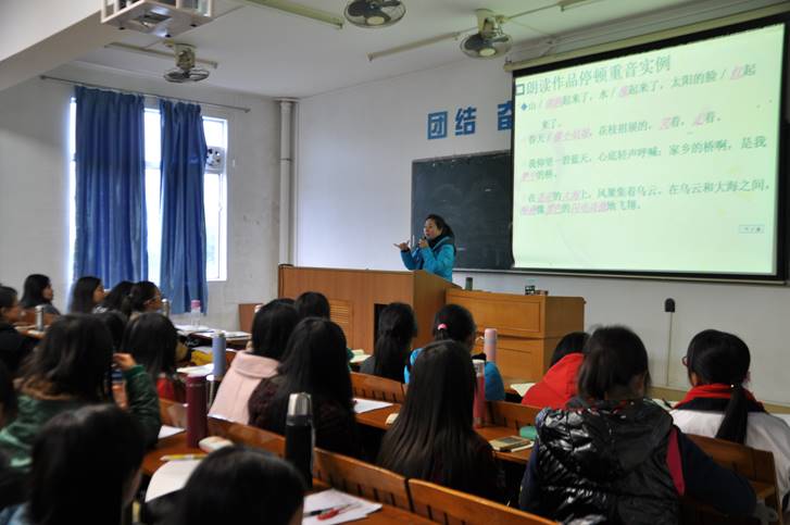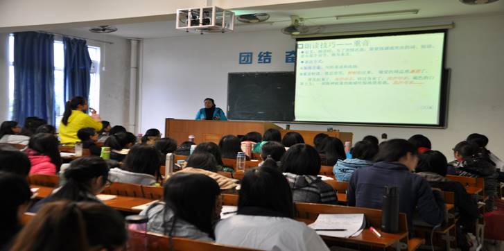 本网讯(记者马晓玲 凌小媛)12月9日,我院邀请了端城小学特级教师凌琳在第二教学楼503室开展了小学语文教学法之朗读技巧讲座。我院廖洁敏老师、慕容勋老师出席了本次讲座。14小学教育班、14初等教育班和13小学教育班的同学也参加了讲座。