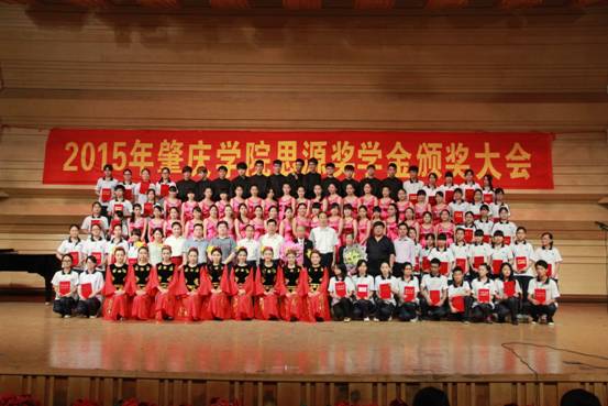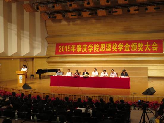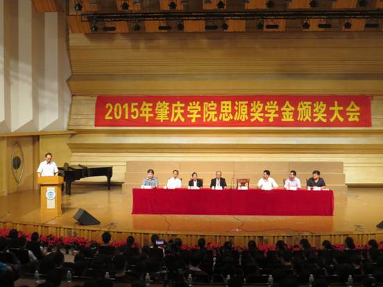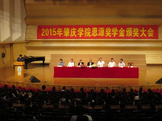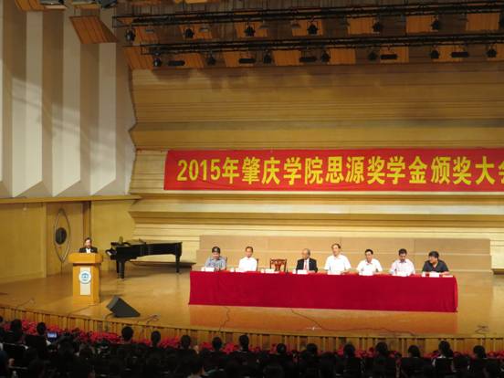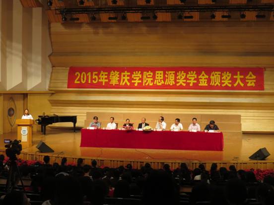 本网讯(通讯员 卓晓玲 吴旭辉 许奕然)5月24日下午,肇庆学院2015年思源奖学金颁奖大会在陈熹音乐厅隆重举行。香港思源基金会顾问黎应锦先生、黎梁淑芷女士、肇庆学院校长和飞、肇庆学院教育发展基金会理事长黎强、肇庆学院教育发展基金会副理事长兼任秘书长刘东廷、肇庆学院教育发展基金会副理事长钟伙彬、教育科学学院院长张旭东、教育科学学院副院长文雪、教育科学学院党委副书记刘远君和教育科学学院全体班主任、辅导员及学生代表共400多人出席了本次颁奖大会。