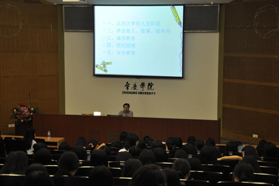 刘远君副书记首先以往届个别毕业生发表的感受为引,告诉同学们必须好好规划自己的大学学习生活、努力提高自身综合素质、珍惜同学之间的友谊和积极锻炼身体,保持健康向上的心态和良好的身体素质。他认为同学们之间要学会换位思考、换位做人做事,诚信做人,更好地对自己、他人和集体负责。刘书记根据大学的各种情况列出了四条线,即以人身安全、防火防盗等为例的高压线、以遵守校纪校规、诚实守信等为例的警戒线、以积极锻炼、提高综合能力等为例的发展线和以考证考研、提升科研能力等为例的提高线。通过丰富的案例为新生们分析了近年来我校学生违纪的特点及违纪的原因,强调认真学习《学生手册》、遵守学校的各项校规校纪的重要性;以近年来社会和学校频频发生的非法传销组织骗取大学生钱财、限制人身自由,以及网络诈骗、校园安全等问题案例为例,强调了大学生加强自我保护、防骗、防盗意识的重要性等。
