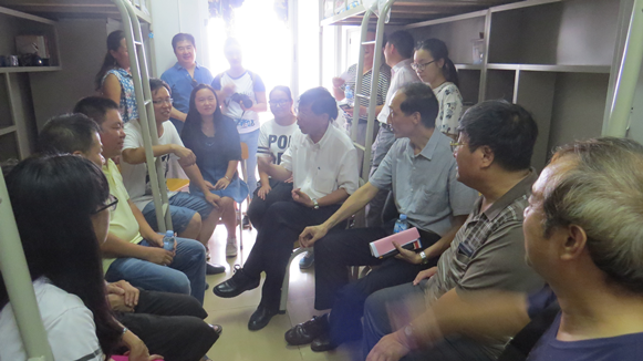 校党委书记曾桓松、校长和飞,党委副书记叶峥嵘、教科院党委书记徐杰、院长张旭东、副院长李炳全、党委副书记刘远君等领导先后到达我院迎新大本营慰问关心工作人员及志愿者们,了解我院新生的报到情况,与新生、家长进行亲切交流,勉励新同学,为他们做入学的思想引导。对困难的学生,学校送上了床上用品爱心大礼包,让新生体会到家的温暖。12日下午4点半,学校和飞校长、叶峥嵘副书记、学院徐杰书记、张旭东院长、李炳全副院长、刘远君副书记等领导亲自走访了新疆籍新生的宿舍,了解他们在学校的食宿等相关情况,并表达了殷切期望。家长们对领导老师们的关怀和问候表达了感激,表示学校环境优美,是学子们读书学习的好地方,领导、老师、师兄师姐们对新生们很关爱,非常放心将孩子送到肇庆学院学习。