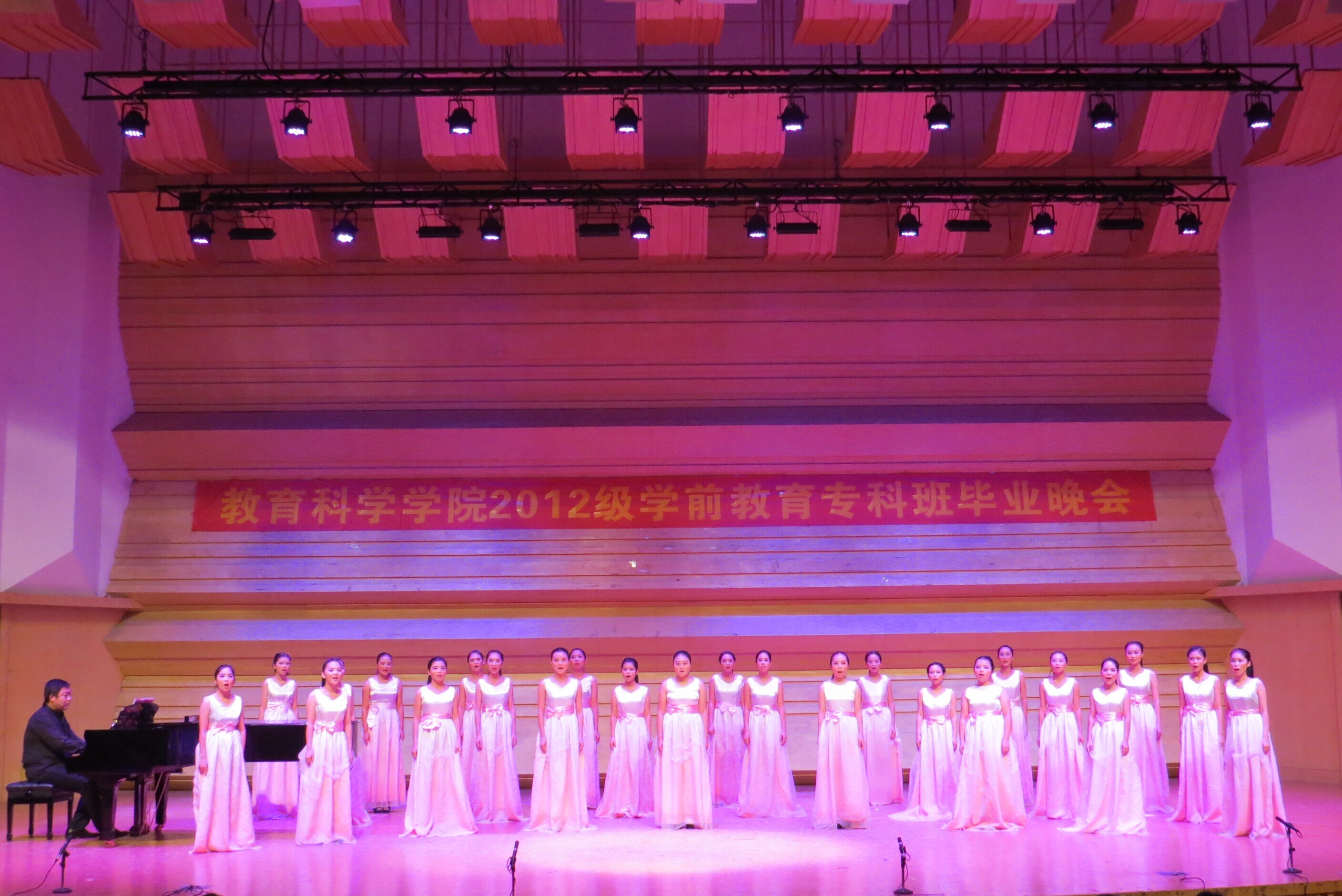 2014年9月27日晚,陈熹音乐厅座无虚席,教育科学学院2012级学前教育专科班毕业晚会在此隆重举行。肇庆学院和飞校长、教育科学学院徐杰书记、张旭东院长、文雪副院长、李炳全副院长、刘远君副书记和肇庆市部分幼儿园的园长、老师及教育科学学院师生共300多人出席观看了本次晚会。