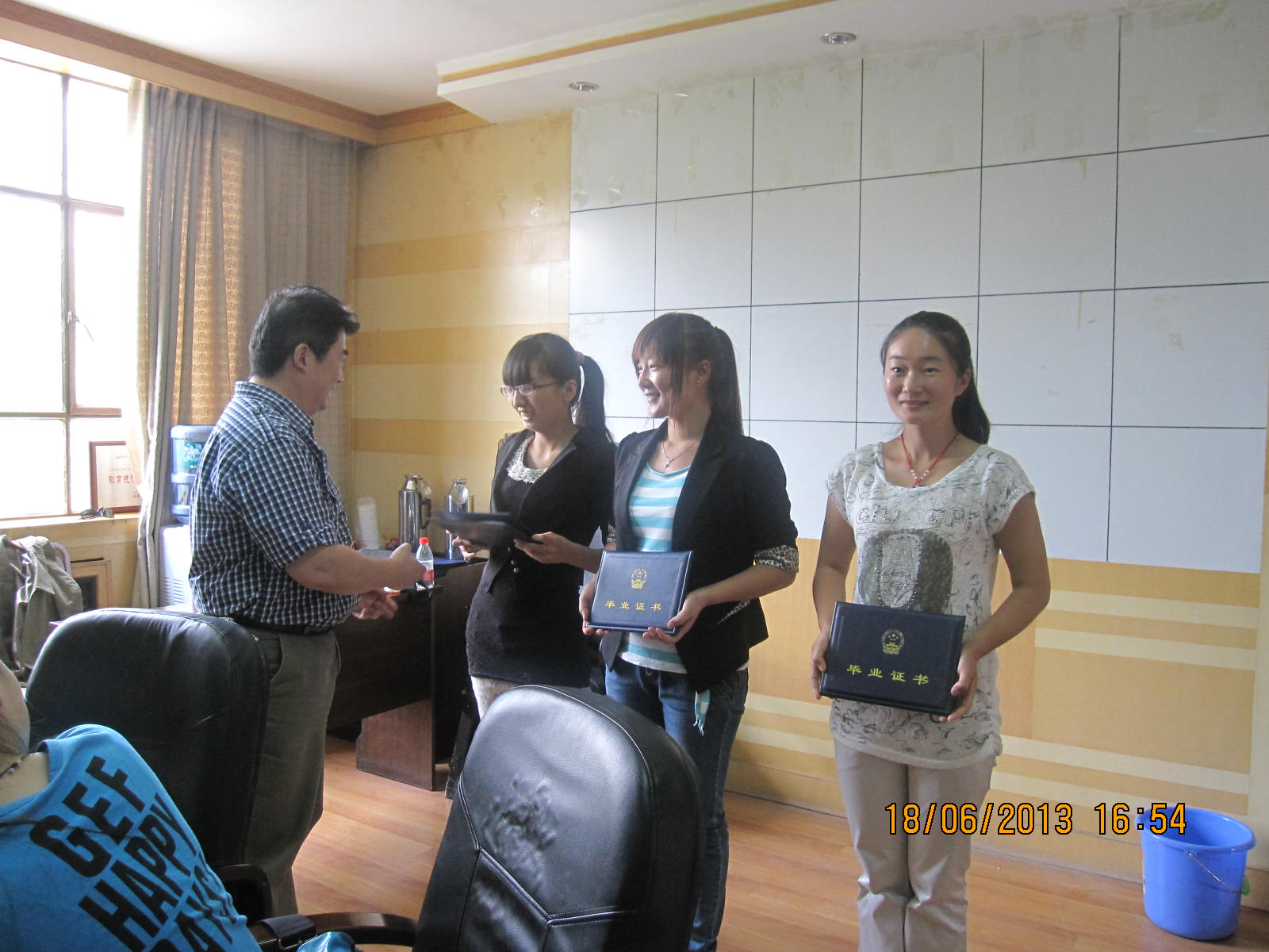 2013年6月16日,授学校委托,教育学院党委书记徐杰带领就业处谭铁伟科长、教育学院辅导员赵书栋老师一行共三人不远万里,前往新疆喀什为我校第一届新疆班毕业生颁发毕业证等证书。该毕业班中有44名同学要回新疆参加招聘考试,已在五月中下旬离校。因该班毕业生离校时间不一,家庭地点分散,为方便学生尽早领到所需证书,学校安排了本次工作。