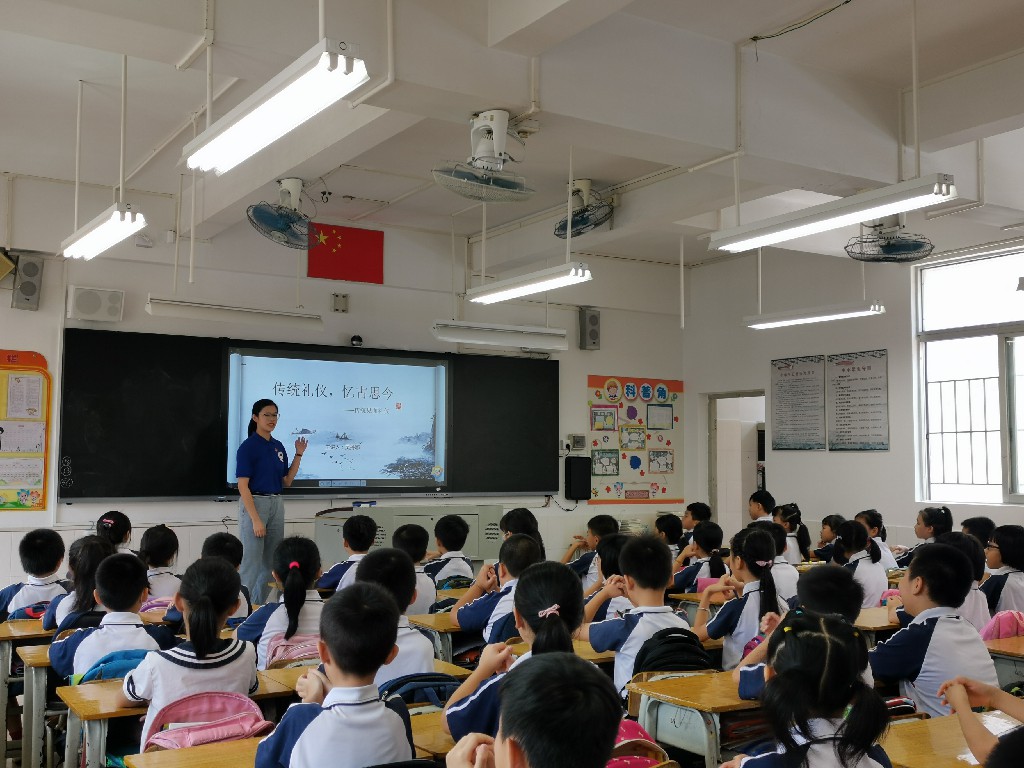 志愿者义教主要面向七小三年级二班全体学生开展,义教活动环节紧凑且内容丰富,干货满满。首先由义教组志愿者吴丹娜进行传统礼仪--见面礼仪教学志愿者讲解“跪拜礼、作揖礼和拱手礼”三种礼仪的正确动作,区分男女见面礼仪。学生们抬手、弯腰,举手投足间感受着传统礼仪文化的熏陶。除此之外,同学们还在讲台上展示自己的学习成果。让同学们在亲自示范过程中能正确认识传统礼仪之中的见面礼仪,更加了解和热爱祖国的传统文化。