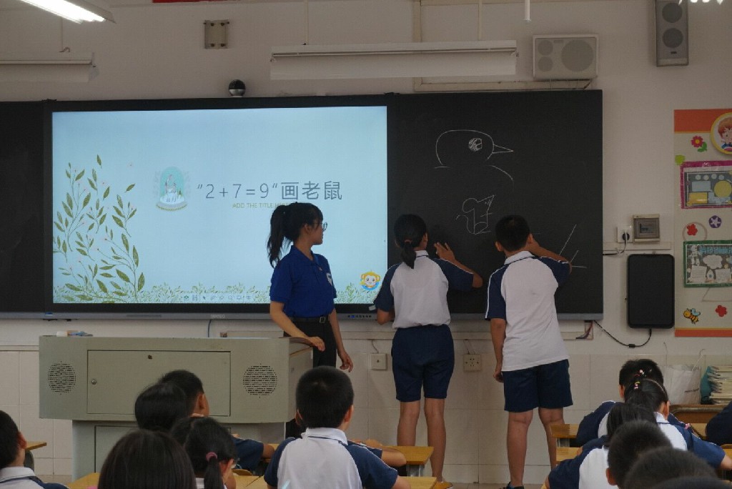 由义教组志愿者林绮彤进行简笔画教学通过简单卡通漫画的形式,现场示范“2+2=4画鸟”“2+7=9画老鼠”……志愿者笔下的一个个栩栩如生的卡通形象深深吸引着学生们的注意力,同学们纷纷拿出纸和笔动手实操。
