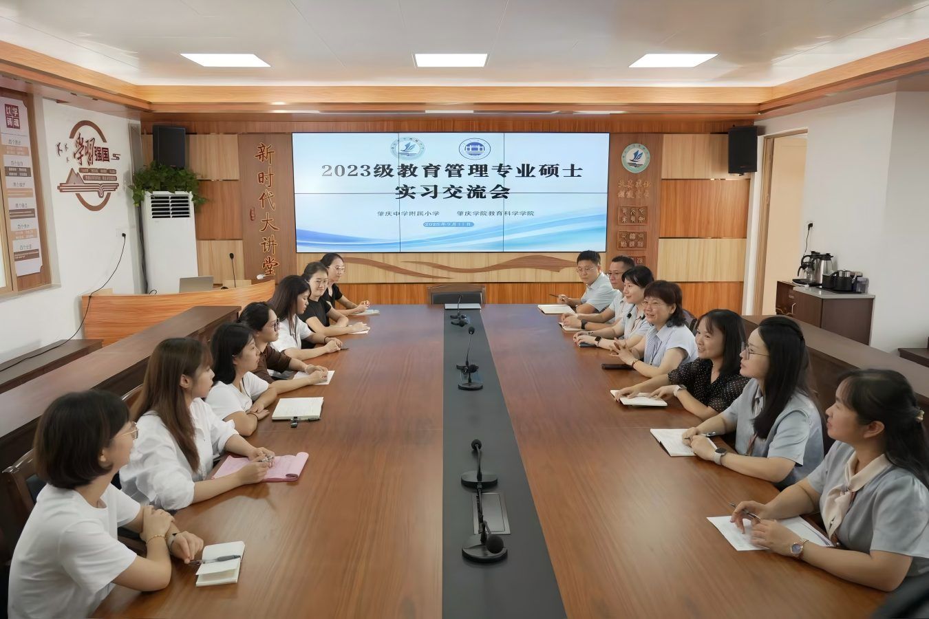 9月11日,教育科学学院与肇庆中学附属小学联合举办的2023级教育管理专业硕士实习交流会在肇庆中学附属小学顺利召开。本次会议聚焦教育硕士实践能力培养与实习管理机制建设。肇庆中学附属小学校长张建华等学校领导班子、教育科学学院副院长曾苗苗,教育硕士校内导师代表及全体2023级教育管理方向硕士研究生共同参会。