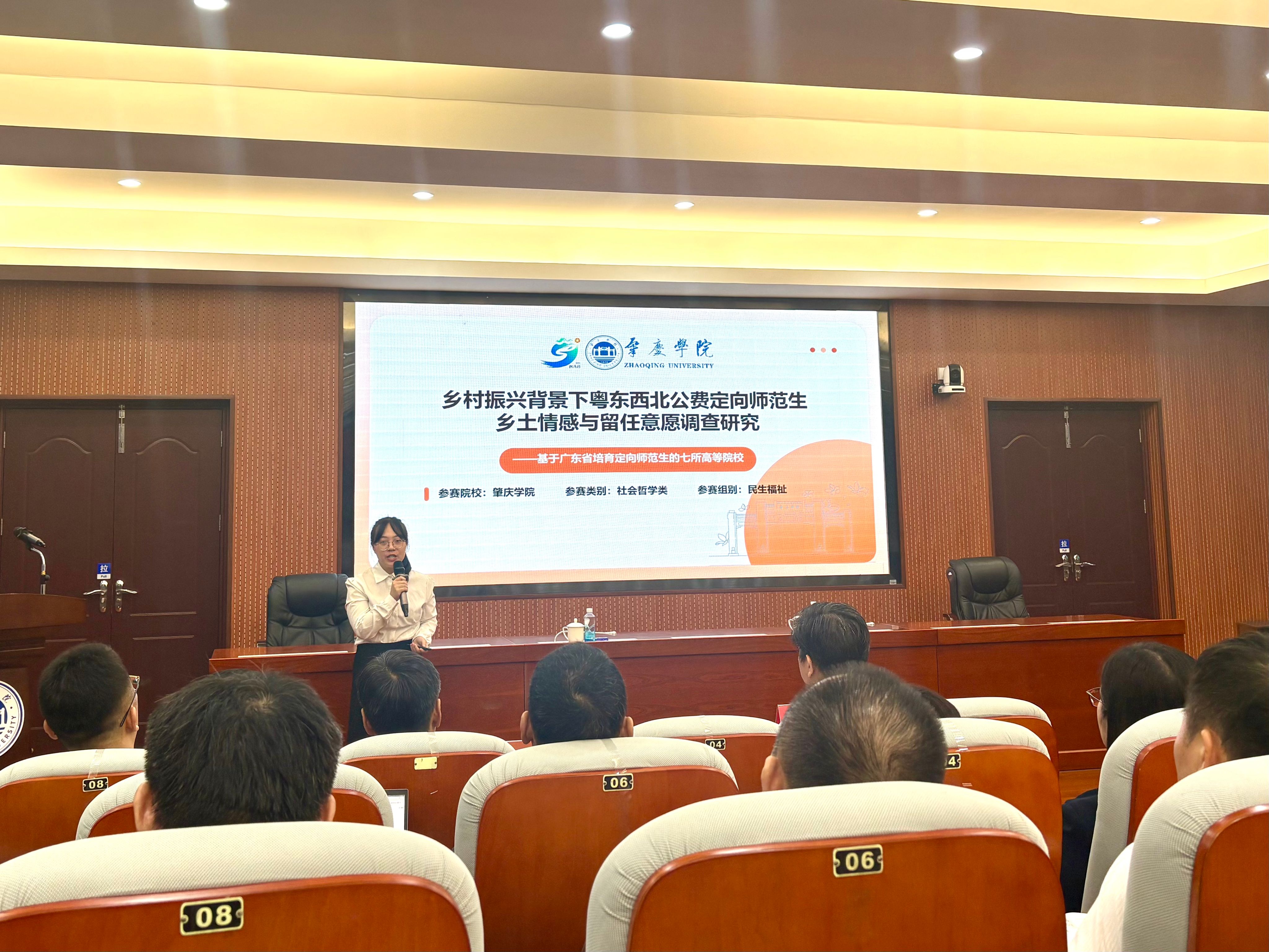 “挑战杯”特等奖《乡村振兴背景下粤东西北公费定向师范生乡土情感与留任意愿调查研究》项目团队代表,来自22小学教育专业的梁嘉昕同学在会上对项目进行了展示。