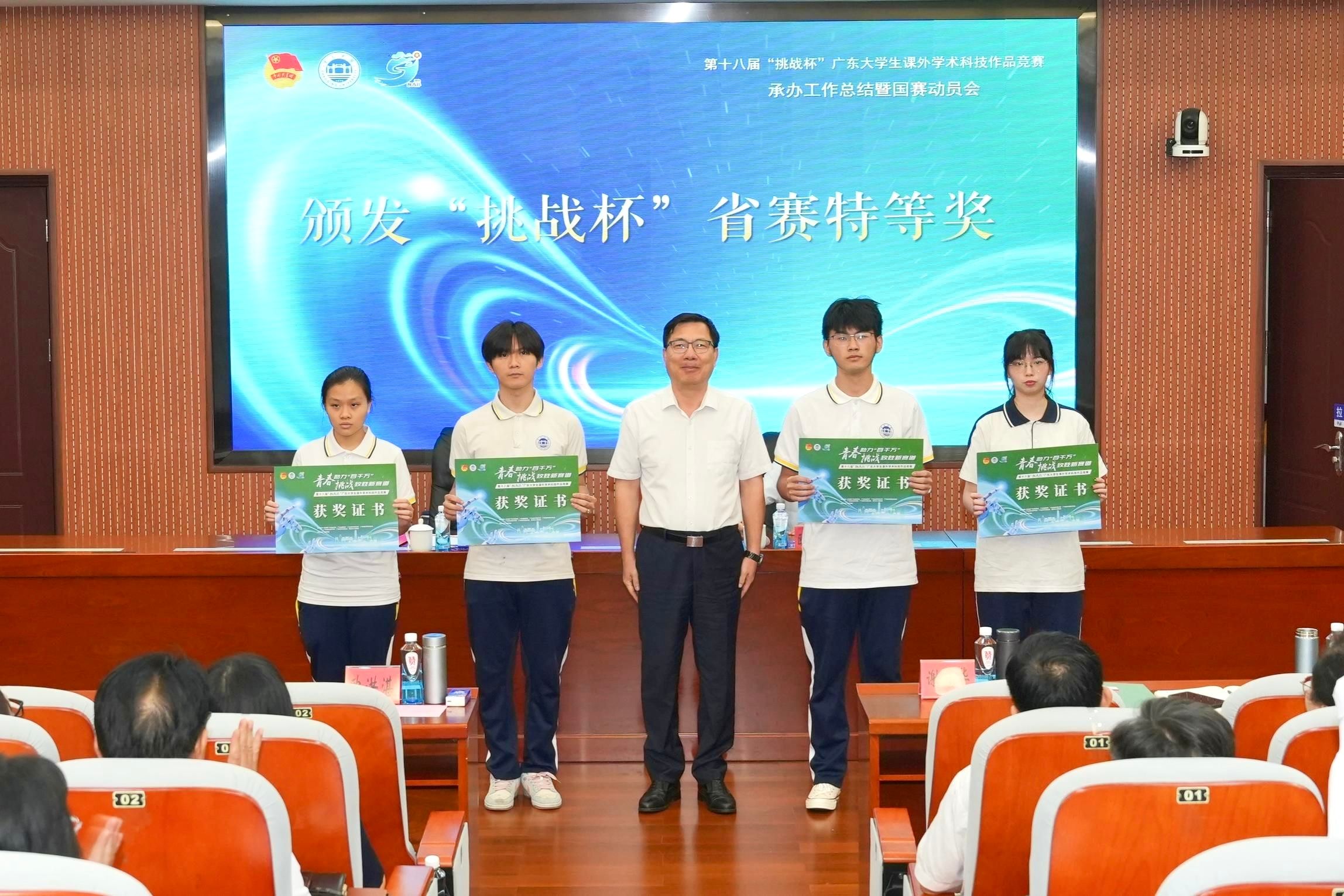 会议伊始,对在本届“挑战杯”省赛中表现卓越的获奖团队进行了表彰。校党委书记谢冠华、副书记欧洪湛亲自为获奖团队颁发荣誉证书。