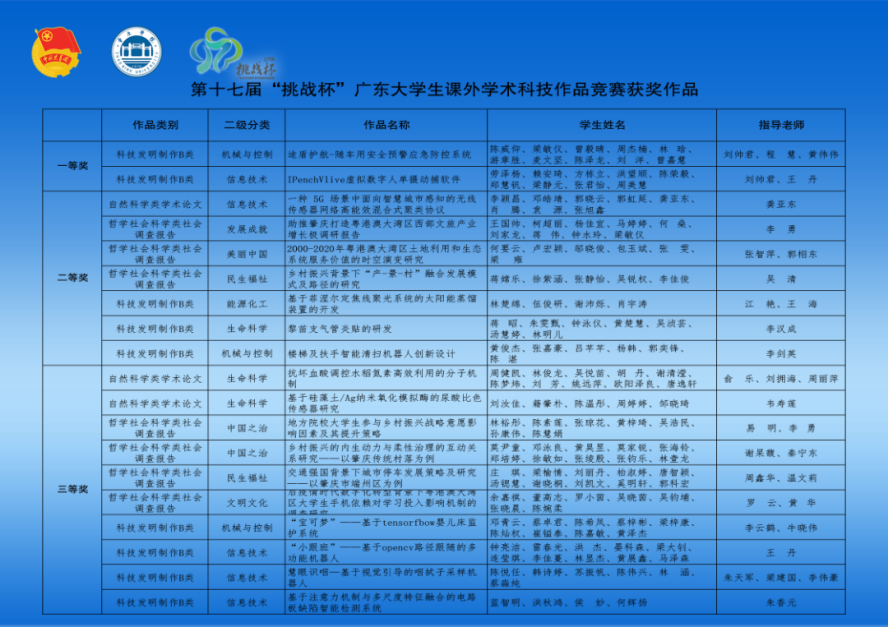 5月27日至28日,由团省委、省教育厅、省科技厅、省科协、广东省社科院、省学联共同主办,中山大学承办的第十七届“挑战杯”广东大学生课外学术科技作品竞赛终审决赛落下帷幕。我院共有2支队伍入围省赛,并取得优异成绩。